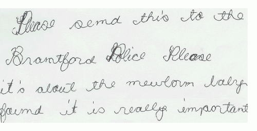 On the afternoon of Thursday, July 28, 2005, a citizen was walking her dog along an abandoned train track in a remote area of near Dufferin Avenue and Parkside Drive in the City of Brantford, when the body of a full term baby boy was discovered. An investigation was immediately launched and officers canvassed the area and DNA testing was undertaken in an effort to find the mother. Police also sought the public's assistance, stressing that the mother could be a neighbour, co-worker, or family member.