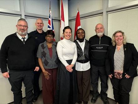 Photo: (L-R: Dave Carrol, Chief Jason Saunders, Loraine Layne, Velika Kitchen-Janzen, Fatia Oyesiji, Naser Hamed, and Police Service Board Chair Councillor Mandy Samwell)