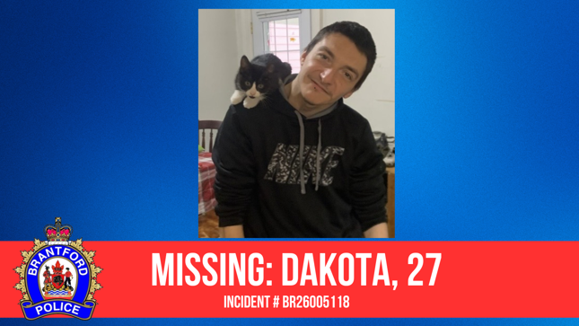 Dakota was reported missing to police on February 11, 2026, and is described as male, with a slim build, and short, dark brown hair. He was last seen at a residence located on Dundas Street near North Park Street in Brantford, on January 31, 2026, wearing a black jumpsuit and white Nike shoes.
